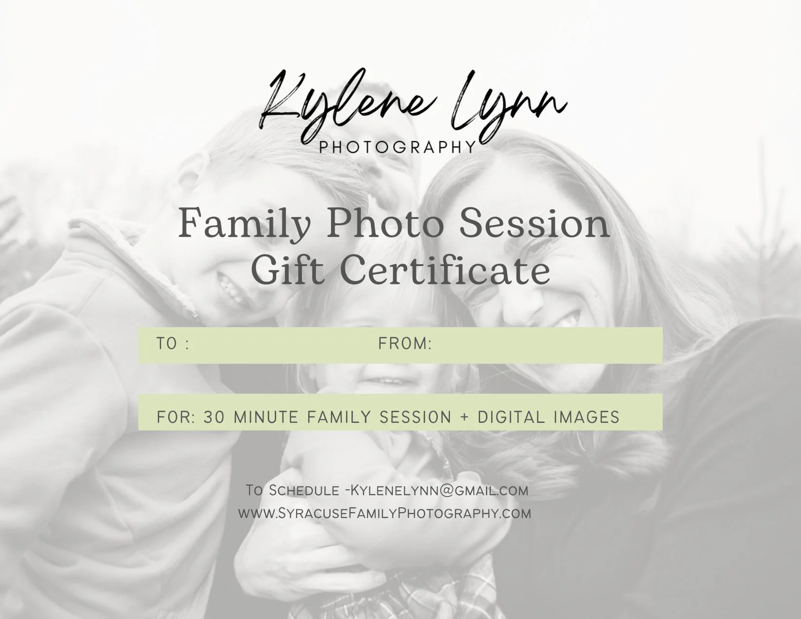 Gift Certificates + Mini Sessions - Syracuse NY Categories: All Gift Certificate Gift Certificates + Mini Sessions - Syracuse NY All | Gift Certificate | One Hour Family Gift Cetificate $475.00 Extended Family Photo Gift Certificate $625.00 30 minute Family Photo Gift Certificate $300.00